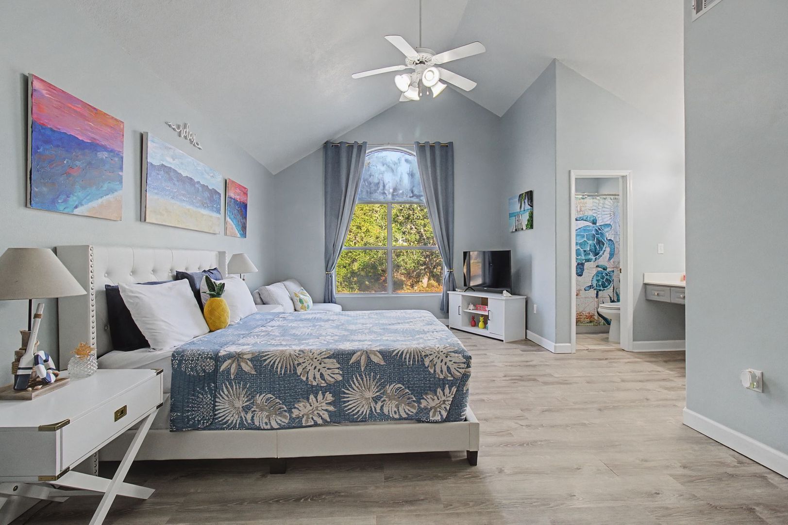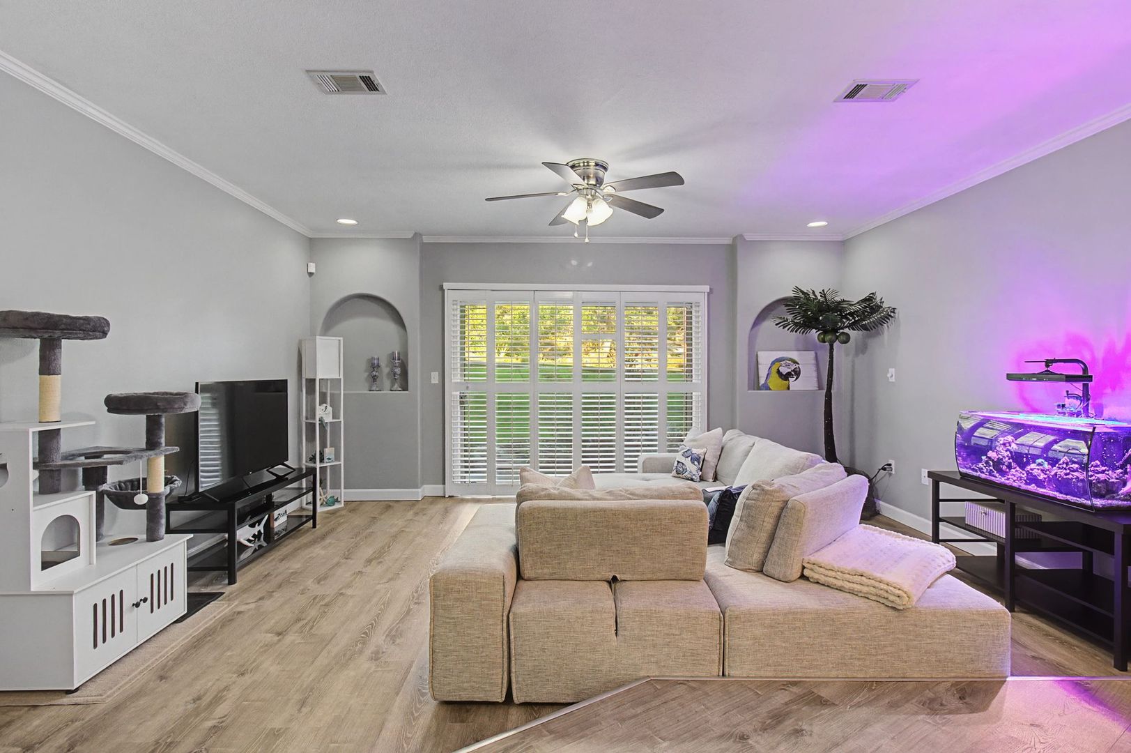 Architectural details give this home extra character, including cathedral ceilings in the primary bedroom, a striking arched window, and elegant arched wall insets in the living room.